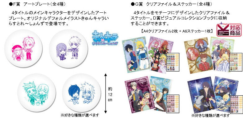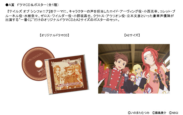 「一番くじ『テイルズオブ』シリーズ2」は、「テイルズ オブ」シリーズを題材に、これまでに発売されたシリーズ、「テイルズ オブ デスティニー」「テイルズ オブ シンフォニア」「テイルズ オブ ヴェスペリア」「テイルズ オブ エクシリア2」の4タイトルをテーマにした、8等級全20種+ラストワン賞の中から必ずいずれかが当たる“ハズレなしのキャラクターくじ”です。